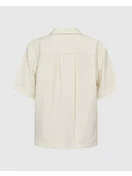 The shirt has a relaxed fit and features a resort collar and a button closure.
