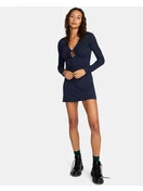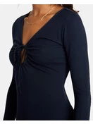 A deep V-neck is accentuated with a keyhole, and a tie at the keyhole gives you the ability to adjust your look. The dark Midnight blue is a great neutral shade for all of your looks. We recommend pairing with a funky pair of tights and boots and a vest for the perfect fall day look.