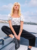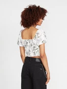 - Fitted waist length printed top with straight neckline, puffy cap sleeves and smocked back panel